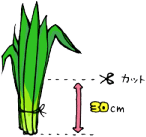 1.10本分くらいの菖蒲の葉を用意して、 30センチくらいに切って束ねます。 |